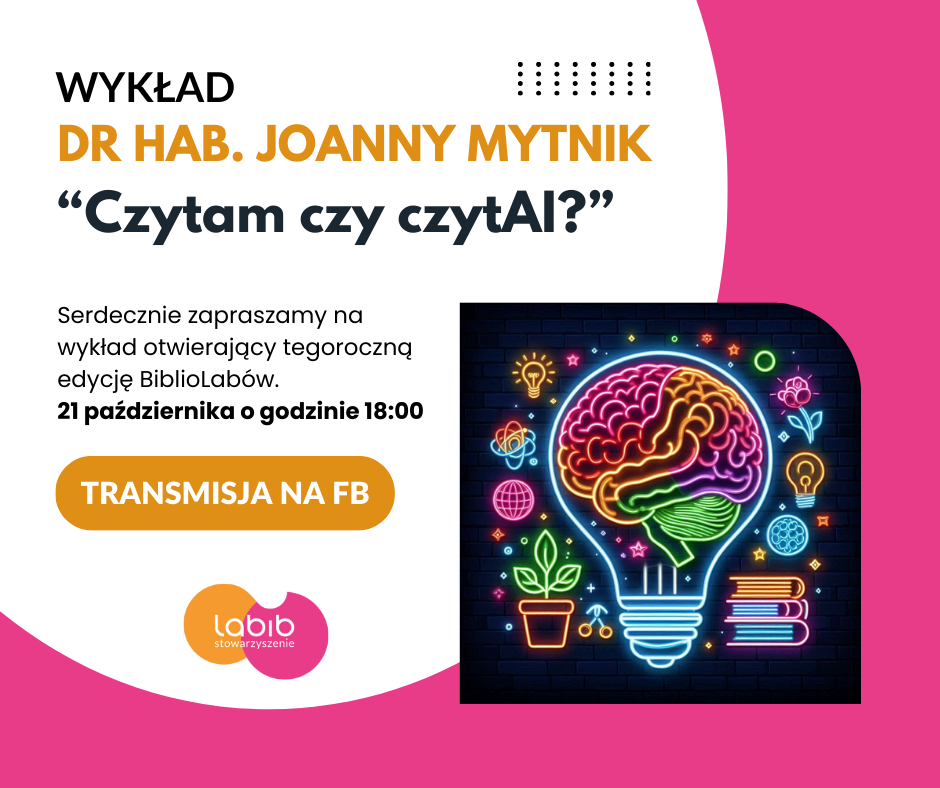 W najbliższy poniedziałek, 21 października o godz. 18.00 zapraszamy na wykład otwierający cykl tegorocznych BiblioLABów “Czytam czy CzytAI”?, który wygłosi